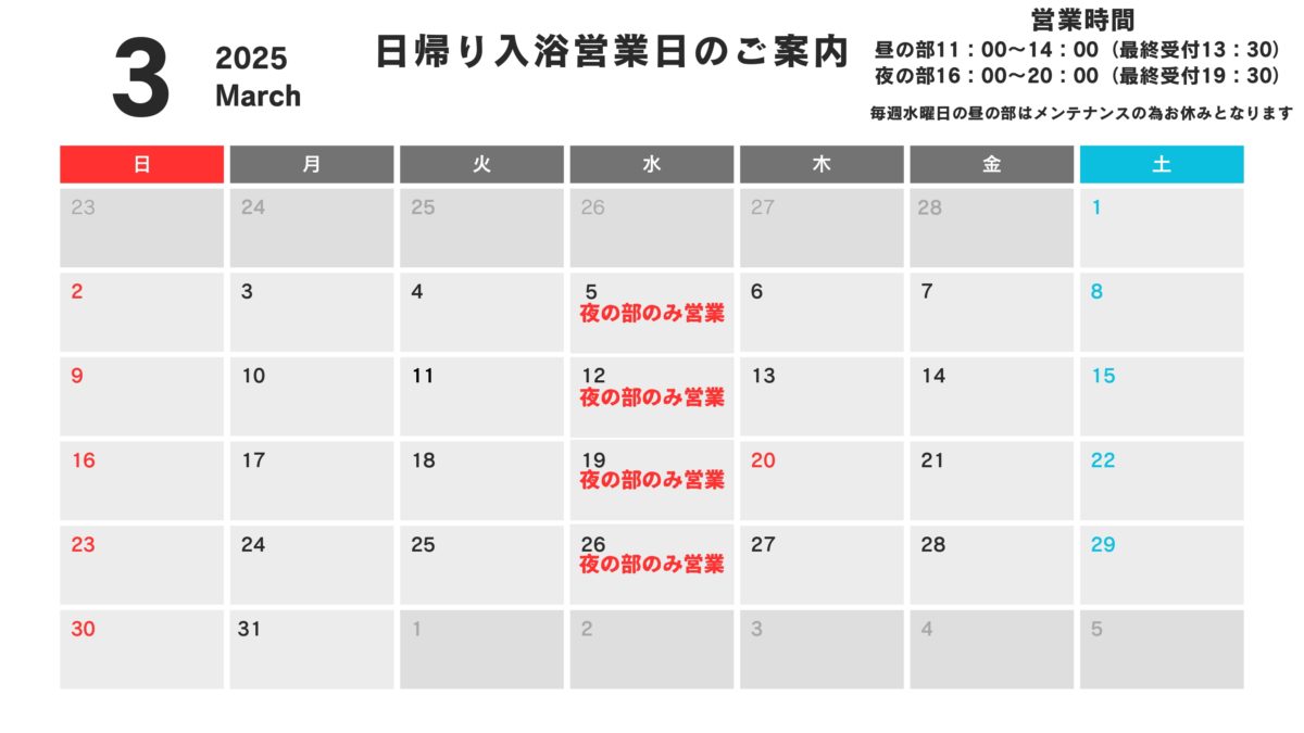 いつも旅館玉子湯をご利用いただき、ありがとうございます。 2025年3月の「日帰り入浴営業日」のご案内をさせていただきます。 春は、新しい門出を迎えてのお祝いの季節でもありますので、是非、ご家族でご夫婦で、親しいお友達同士で、玉子湯でのんびりとご滞在いただければ幸いです。 皆様のご利用をお待ち致しております。