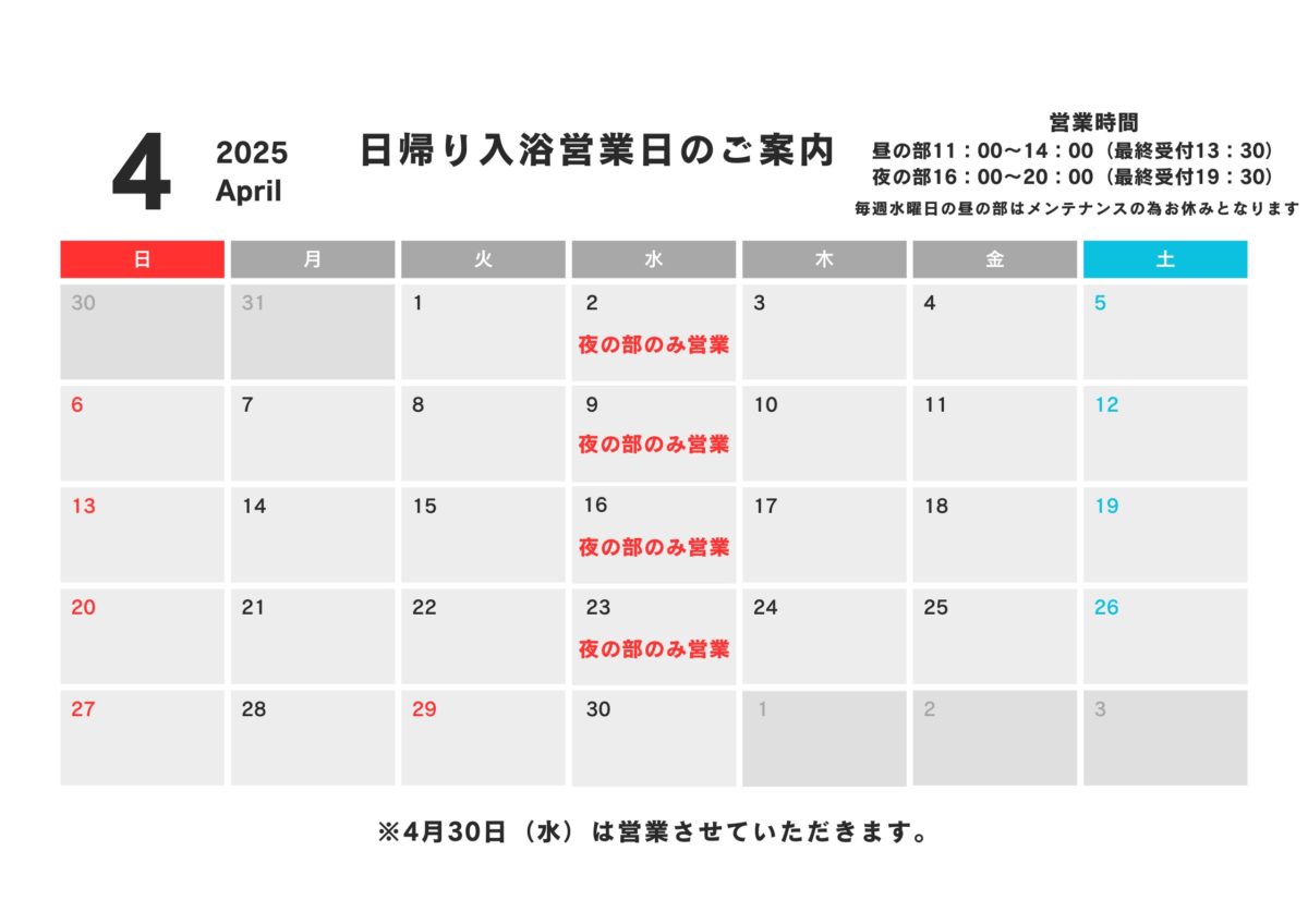 4月30日(水)は昼の部・夜の部ともに日帰り入浴の営業を致します。 ご家族様で、ご友人同士で、是非お立ち寄りください。 ドライブや観光を楽しむ方も多くなる季節です。是非、お立ち寄りいただき白濁の硫黄温泉をお楽しみいただければ幸いです。