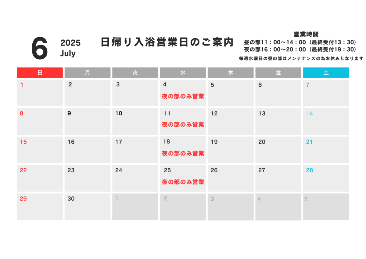 いつも旅館玉子湯をご利用いただき、誠にありがとうございます。 2025年6月の「日帰り入浴営業日」をご案内させていただきます。 GW期間中、多くの皆様にご利用いただき、スタッフ一同御礼申し上げます。 6月もお待ちしておりますので、白濁の硫黄温泉でのんびりとご滞在いただければ幸いです。