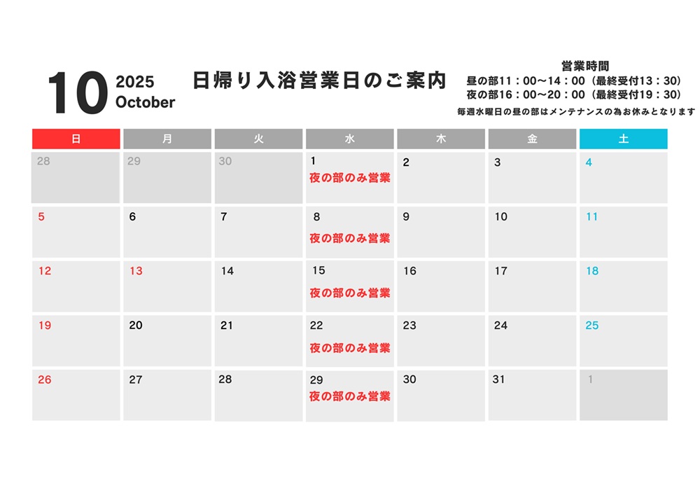 2025年10月「日帰り入浴営業日」のご案内
