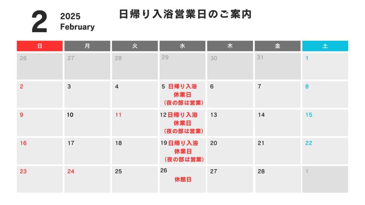 いつも旅館玉子湯をご利用いただき、ありがとうございます。 2025年2月の「日帰り入浴休業日」のご案内をさせていただきます。 2月26日(水)は誠に勝手ながら、全館休館日とさせていただきます。 2月も後半頃からは、若干春を感じる気温になると思いますので、当館の温泉でのんびりとご入浴いただければ幸いです。 皆様のご利用をお待ち致しております。