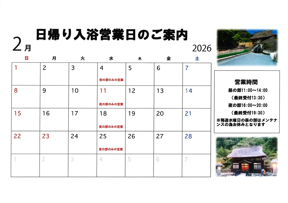 2026年2月の日帰り入浴営業日につきまして、ご案内申し上げます。