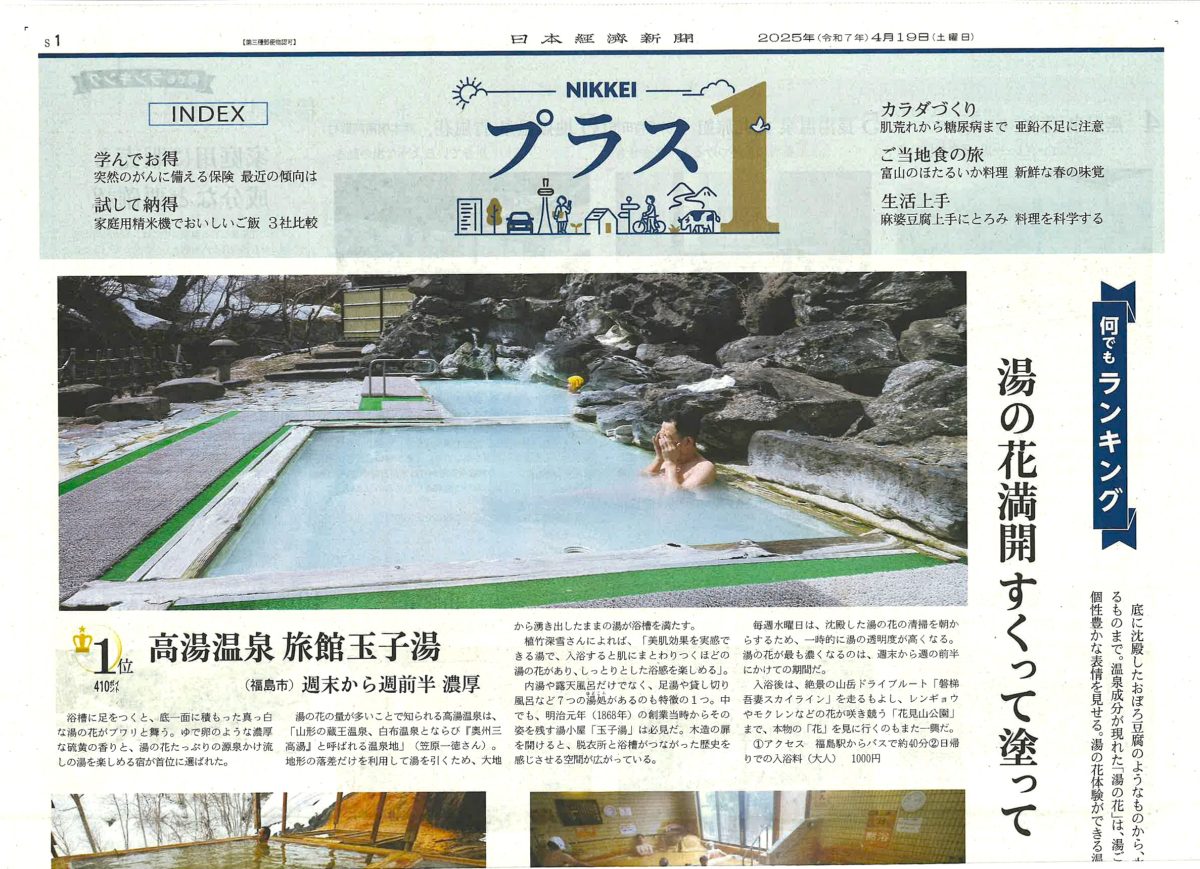いつも旅館玉子湯をご利用いただき、誠にありがとうございます。 4月19日(土)日経新聞・土曜版『NIKKEIプラス1』の1面、何でもランキング「湯の花満開すくって塗って」において、当館が第一位に選ばれ、掲載されました。