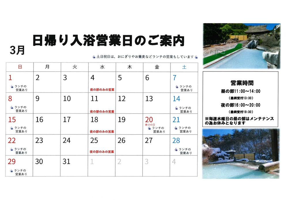 2026年3月「日帰り入浴営業日」のご案内