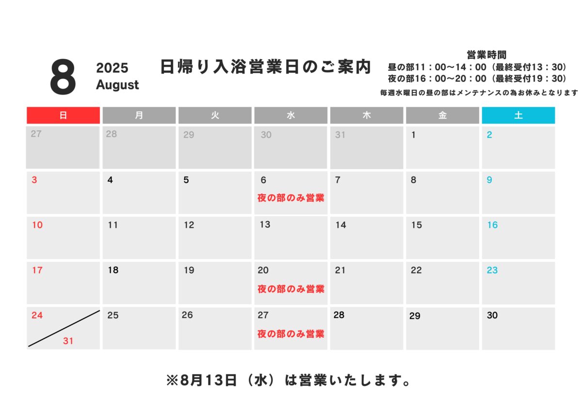 2025年8月の「日帰り入浴営業日」をご案内させていただきます。