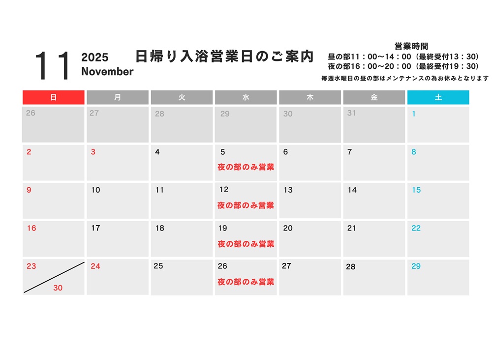 11月の日帰り入浴営業日についてご案内申し上げます。